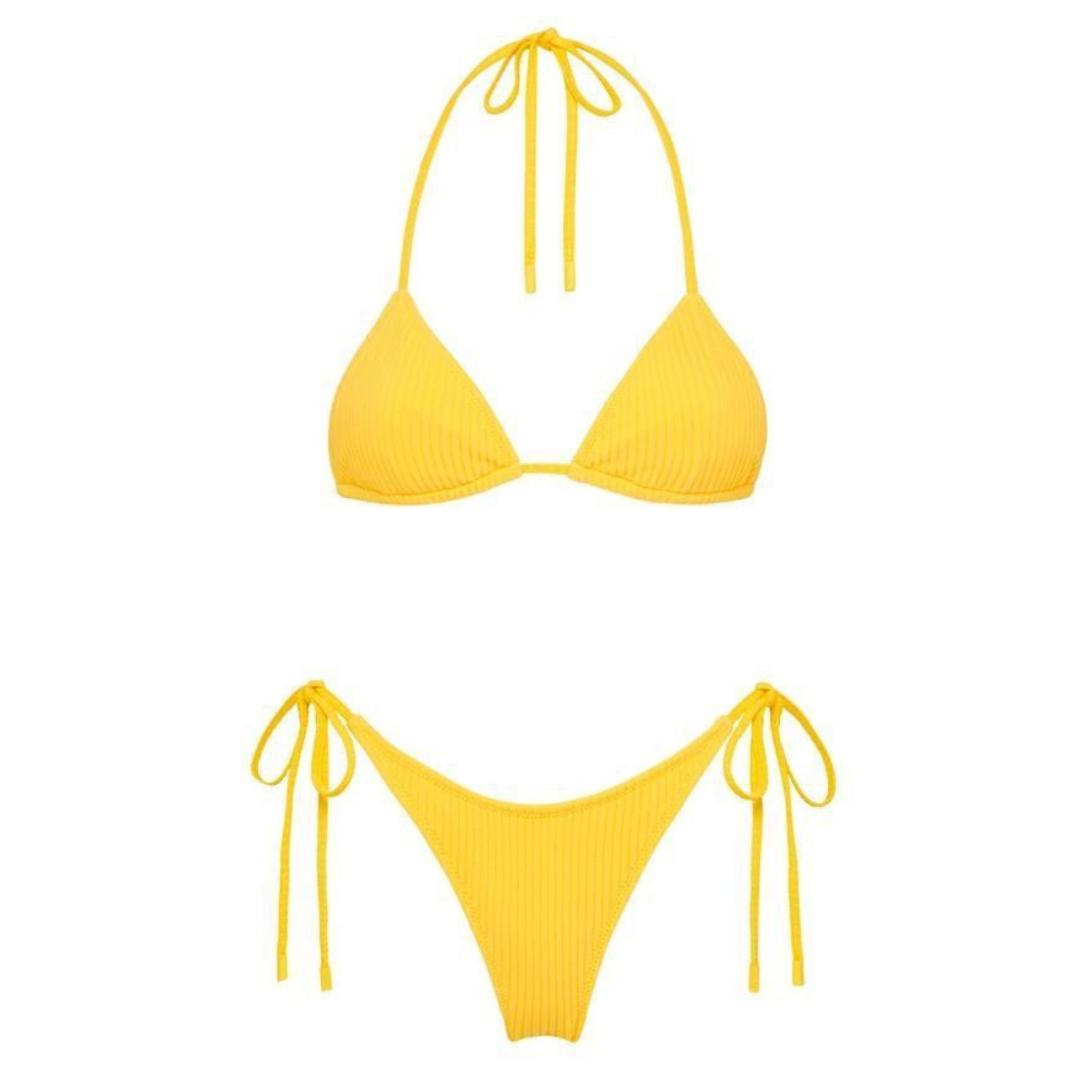 Bikini de dos piezas en amarillo vibrante con textura acanalada. Top triángulo y bottom brasileño con lazos ajustables para un fit perfecto. Fresco, cómodo y lleno de energía.