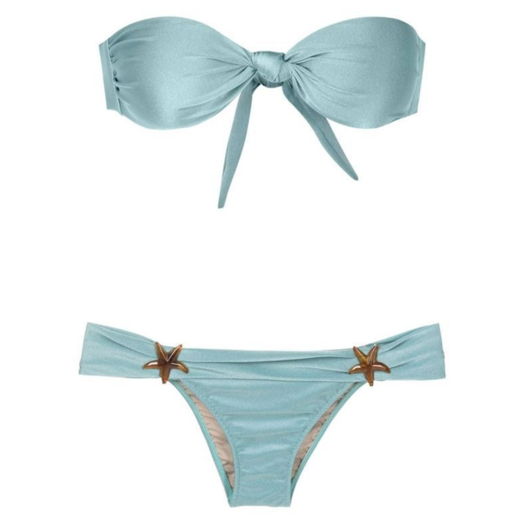 El top presenta un drapeado artesanal que converge en un nudo central, permitiendo un ajuste favorecedor y seguro. La pieza inferior destaca por su banda ancha fruncida que se asienta suavemente sobre la cadera. El diseño cuenta con dos exclusivos apliques en forma de estrella de mar con acabado efecto carey, que aportan un toque de joyería orgánica y distinción al conjunto.