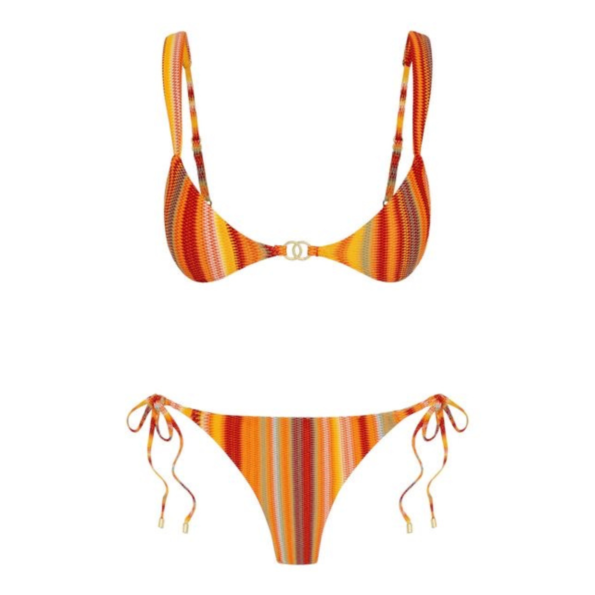 Un bikini de rayas cálidas en tonos naranja, rojo y amarillo que captura la intensidad de un atardecer de verano. Vibrante, atrevido y lleno de energía.